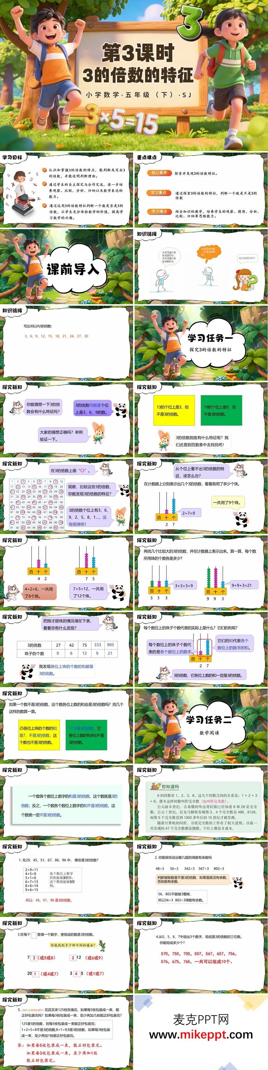 這是蘇教五年級下冊數(shù)學《3的倍數(shù)的特征》教學課件,共30頁,遵循"猜想—驗證—應(yīng)用"的探究邏輯。課前先復(fù)習2、5的倍數(shù)特征,引發(fā)認知沖突,再列出30以內(nèi)3的倍數(shù),為探究做鋪墊。學習任務(wù)一先讓學生猜想3的倍數(shù)個位特征,通過反例推翻猜想;再借助百數(shù)表和計數(shù)器,發(fā)現(xiàn)3的倍數(shù)特征是各位上數(shù)字的和是3的倍數(shù),并通過正反例驗證結(jié)論。學習任務(wù)二拓展數(shù)學閱讀(介紹完全數(shù)),再通過分層練習鞏固知識,包括判斷3的倍數(shù)、填數(shù)組成3的倍數(shù)、解決包裝和生產(chǎn)等實際問題,讓學生體會知識的應(yīng)用價值。最后以知識總結(jié)梳理核心規(guī)律,幫助學生系統(tǒng)掌握判斷3的倍數(shù)的方法。