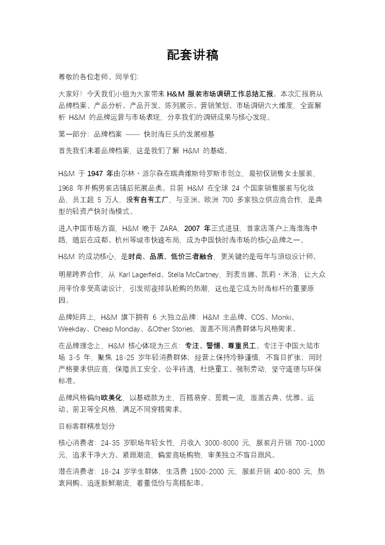 這套PPT是一份關(guān)于H&M品牌市場調(diào)研報告的演示文稿,內(nèi)容系統(tǒng)而全面。PPT整體設(shè)計簡潔現(xiàn)代,以紅、白、黑為主色調(diào),符合H&M的品牌視覺形象。文檔內(nèi)容通過清晰的章節(jié)劃分,邏輯清晰地展示了調(diào)研的各個方面。PPT的內(nèi)容結(jié)構(gòu)主要分為六個核心部分:1.品牌檔案:介紹了H&M的品牌歷史、全球業(yè)務(wù)、品牌理念(專注、警惕、尊重員工)、目標(biāo)客群(以24-35歲的年輕職業(yè)女性為核心)以及在杭州地區(qū)的門店分布(如利星名品店、西湖銀泰店等)和選址策略(專注于黃金商圈)。2.產(chǎn)品分析:通過數(shù)據(jù)圖表詳細分析了H&M的產(chǎn)品構(gòu)成、價格區(qū)間、色彩與面料風(fēng)格。例如,用表格展示了各類別產(chǎn)品(如連衣裙、套衫)的占比,用價格波段圖說明了主力產(chǎn)品集中在39.9至499元的實惠區(qū)間,并通過圖片對比了LADIES系列的優(yōu)雅色系和DIVIDED系列的青春亮色。3.產(chǎn)品開發(fā)計劃:提出了三個具體的產(chǎn)品主題,包括“春日風(fēng)尚--波西米亞”、“DIVIDED-隨心搭配”和“大衛(wèi)·貝克漢姆精選”,并分別展示了主打款式、色彩板和風(fēng)格理念的視覺化頁面。4.陳列與展示:圖文并茂地闡述了H&M店鋪的整體形象、統(tǒng)一的櫥窗風(fēng)格、依據(jù)“紅線原則”的重點區(qū)域(如入口A區(qū)、試衣間外)陳列,以及具體的疊裝、側(cè)掛、正掛和模特出樣等細節(jié)規(guī)范。5.營銷策劃:系統(tǒng)分析了H&M的四大營銷策略,包括與頂級設(shè)計師的跨界合作(產(chǎn)品策略)、全媒體廣告宣傳、在線銷售渠道的拓展以及季中折扣、節(jié)日促銷等靈活的促銷策略。6.市場調(diào)研總結(jié):基于問卷調(diào)查數(shù)據(jù),以信息圖形式分析了消費者選擇H&M的主要理由(如價格合理、地段便利)、平均購物時間,并指出了品牌存在的劣勢(如質(zhì)量口碑、市場競爭激烈),最后提出了相應(yīng)的發(fā)展建議。整體而言,這份PPT通過大量圖表、數(shù)據(jù)、圖片和簡潔的文字說明,從多個維度對H&M品牌進行了深入剖析,視覺化程度高,信息點明確,是一份結(jié)構(gòu)完整、論據(jù)充實的商業(yè)分析報告。
