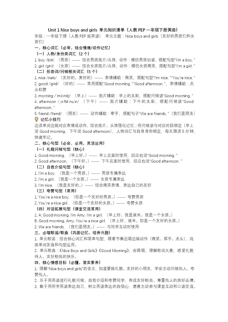 這套PPT采用童趣校園風(fēng)格,圍繞人教PEP一年級下冊Unit1《Nice boys and girls》展開單元復(fù)習(xí)。內(nèi)容分為詞匯短語、核心句型、考點(diǎn)提分三大板塊:系統(tǒng)梳理thank、Mr、Miss、sorry等重點(diǎn)詞匯及Thank you、You're welcome等常用表達(dá);解析禮貌用語的使用場景與問答搭配規(guī)則;通過問候、致謝、道歉、Excuse me用法等高頻考點(diǎn),結(jié)合單選、情景對話、句子翻譯等多樣化題型進(jìn)行鞏固練習(xí)。整體設(shè)計(jì)貼合低年級認(rèn)知特點(diǎn),幫助學(xué)生夯實(shí)單元基礎(chǔ),提升日常英語交際的規(guī)范性與流利度。
