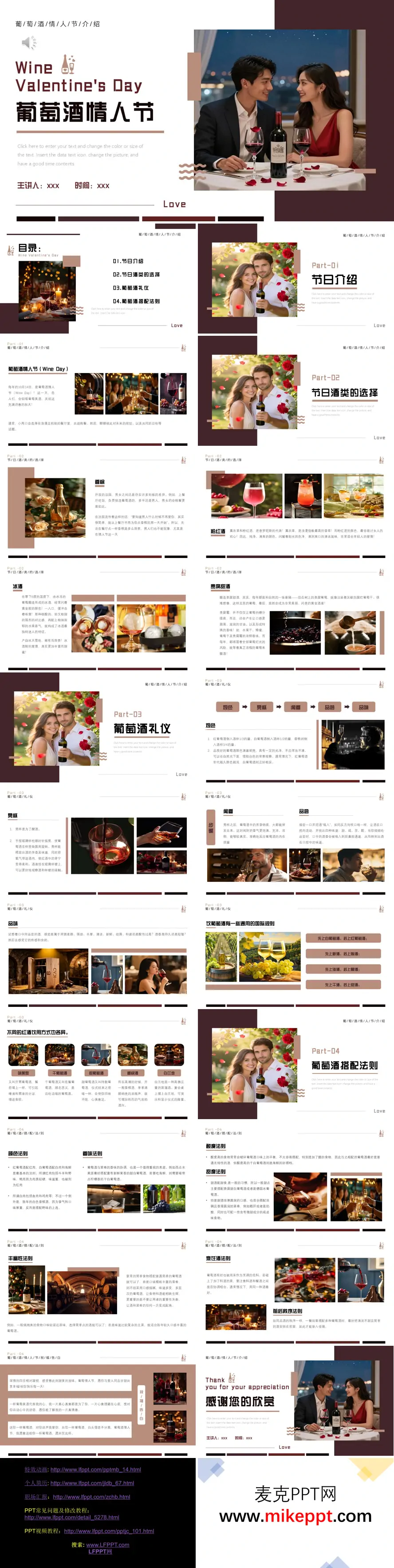 這套PPT是關(guān)于“葡萄酒情人節(jié)”的介紹材料。其內(nèi)容主要圍繞葡萄酒情人節(jié)的背景、慶祝方式、以及相關(guān)的葡萄酒知識展開。PPT的圖片和版式設(shè)計以浪漫、優(yōu)雅為主題,使用了葡萄酒杯、葡萄藤蔓、愛心、情侶剪影、燭光晚餐、各色葡萄酒(如香檳、粉紅酒、冰酒、貴腐甜酒)等視覺元素,營造出溫馨、甜蜜的節(jié)日氛圍。整體色調(diào)偏向暖色系,如酒紅、金色、粉色,與葡萄酒主題緊密契合。從內(nèi)容結(jié)構(gòu)上看,PPT分為四個主要部分。第一部分介紹了“葡萄酒情人節(jié)”本身,它是一個在每年10月14日慶祝的節(jié)日,戀人們通常會共進晚餐,品嘗葡萄酒,并交流對未來的規(guī)劃。第二部分詳細推薦了幾種適合情人節(jié)的“節(jié)日酒類”,包括象征愛意的香檳、代表年輕愛情的粉紅酒、珍貴濃郁的冰酒,以及風味獨特的貴腐甜酒,并分別闡述了它們與愛情寓意的關(guān)聯(lián)。第三部分系統(tǒng)講解了“葡萄酒禮儀”,涵蓋了品酒的完整步驟:觀色、晃杯、聞香、品味,并說明了不同種類葡萄酒(如開胃酒、佐餐酒、餐后酒)的飲用順序和場合。第四部分則列出了“葡萄酒搭配法則”,如“紅肉配紅酒,白肉配白酒”的顏色法則,以及考慮香味、酸度、甜度協(xié)調(diào)性的原則,用以指導(dǎo)節(jié)日用餐時的酒菜搭配。最后,PPT以浪漫的葡萄酒情人節(jié)祝福和告白文字作為結(jié)尾,與開篇的節(jié)日主題形成呼應(yīng),完整地呈現(xiàn)了一個以葡萄酒為載體的、充滿儀式感的情人節(jié)慶祝指南。