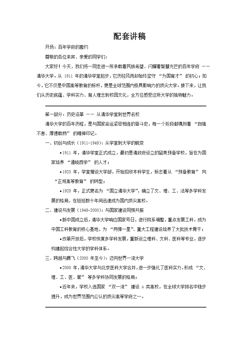 這套PPT是一份關(guān)于“趣洋學(xué)校”的簡(jiǎn)介材料,但其文檔內(nèi)容實(shí)際上是“清華大學(xué)”的詳細(xì)介紹。整個(gè)PPT結(jié)構(gòu)清晰,分為三個(gè)主要部分。 第一部分是“學(xué)校簡(jiǎn)介”。這部分以文字介紹為主,詳細(xì)闡述了清華大學(xué)的學(xué)校概況、歷史沿革、歷任領(lǐng)導(dǎo)及知名校友。核心信息包括:清華大學(xué)是國(guó)家重點(diǎn)大學(xué),被譽(yù)為“紅色工程師的搖籃”;其前身清華學(xué)堂建于1911年,校名源于“清華園”;經(jīng)歷了抗戰(zhàn)南遷、組建西南聯(lián)大、院系調(diào)整等重要?dú)v史階段;并擁有眾多杰出的院士和校友。 第二部分是“文化傳統(tǒng)”。這部分圖文并茂,重點(diǎn)展示了清華的核心精神與制度。內(nèi)容包括:清華大學(xué)的三環(huán)同心圓校徽及其起源;校訓(xùn)“自強(qiáng)不息、厚德載物”的典故,源于1914年梁?jiǎn)⒊难葜v;以“行勝于言”為核心的校風(fēng)學(xué)風(fēng);以及學(xué)校的院系設(shè)置、師資隊(duì)伍和科研項(xiàng)目概況,展示了其作為綜合性研究型大學(xué)的實(shí)力。 第三部分是“校園風(fēng)采”。這部分以圖片和簡(jiǎn)介的形式,生動(dòng)呈現(xiàn)了清華園的經(jīng)典建筑與景觀。介紹的主要地點(diǎn)包括:象征性的二校門、莊嚴(yán)的大禮堂、悠久的圖書館(清華學(xué)堂)、早期的科學(xué)館、幽靜的“水木清華”與古月堂、歷史上的工字廳、近春園的荷塘、現(xiàn)代化的理學(xué)院樓和紫荊公寓,以及西體育館、綜合體育館、第六教學(xué)樓等教學(xué)運(yùn)動(dòng)設(shè)施。每一處景致都承載著學(xué)校的歷史與文化。 總體而言,這套PPT通過“學(xué)校概貌-文化精神-實(shí)體校園”的邏輯框架,系統(tǒng)性地介紹了清華大學(xué)的歷史底蘊(yùn)、學(xué)術(shù)傳統(tǒng)與校園風(fēng)貌。