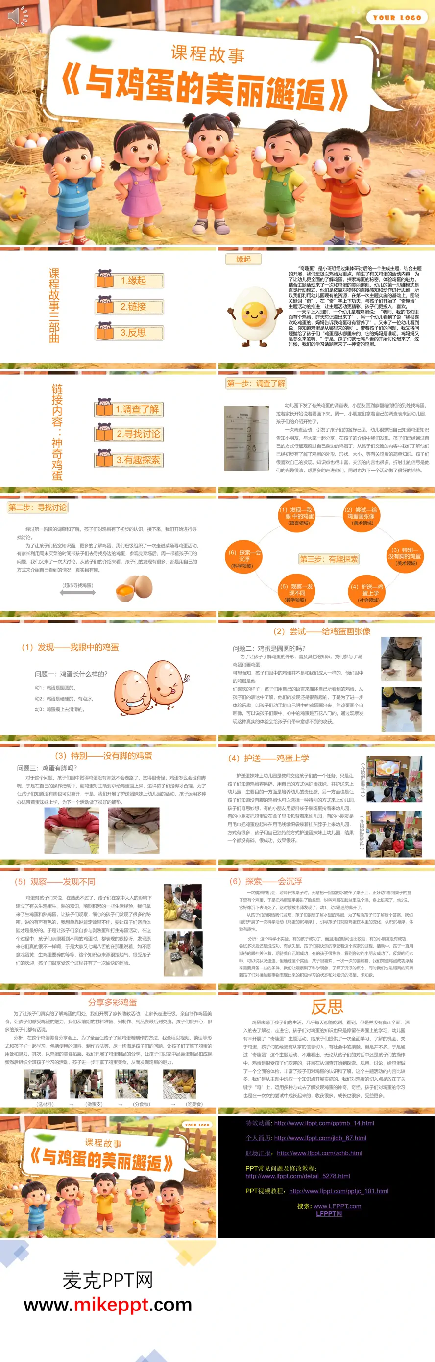 這套 PPT 以 “雞蛋” 為探究核心,用溫暖的農(nóng)場(chǎng)風(fēng)格完整呈現(xiàn)了一場(chǎng)生活化的幼兒園生成課程。 課程從孩子對(duì) “雞媽媽下蛋” 的好奇緣起,順勢(shì)開(kāi)啟 “神奇雞蛋” 的探究之旅。先通過(guò)家庭調(diào)查表讓孩子初步感知雞蛋,再走進(jìn)菜場(chǎng)、超市實(shí)地尋找雞蛋,結(jié)合討論分享積累認(rèn)知。隨后進(jìn)入多領(lǐng)域探索:用語(yǔ)言描述雞蛋外形、美術(shù)創(chuàng)作雞蛋畫(huà)像,探究 “雞蛋沒(méi)有腳” 的趣味問(wèn)題,完成 “護(hù)送雞蛋上學(xué)” 的責(zé)任感挑戰(zhàn),觀察生熟雞蛋差異,還做了雞蛋沉浮科學(xué)實(shí)驗(yàn),最后延伸到家長(zhǎng)進(jìn)班制作雞蛋美食,讓孩子在親身體驗(yàn)中全面認(rèn)識(shí)雞蛋的形態(tài)、特性與用途。 整套 PPT 以孩子的真實(shí)探究軌跡為主線,用童趣圖文和活動(dòng)照片還原課堂場(chǎng)景,展現(xiàn)了 “發(fā)現(xiàn)問(wèn)題 — 探究實(shí)踐 — 拓展應(yīng)用” 的自然學(xué)習(xí)過(guò)程,是生動(dòng)的幼兒園生活化課程范例。