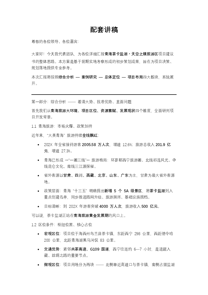 這套PPT的內容圍繞“青海茶卡鹽湖·天空之鏡旅游區(qū)”項目建議書展開,以圖文并茂的方式系統(tǒng)闡述了項目的規(guī)劃思路與發(fā)展藍圖。PPT的圖片內容可以歸納為以下幾個方面:首先,現(xiàn)狀分析部分的圖片直觀展示了茶卡鹽湖的資源稟賦與當前問題。其中包括茶卡鹽湖“天空之鏡”般的壯麗自然風光照片,湖面如鏡,倒映天空;鹽資源(如“大青鹽”結晶)的特寫;以及冬季與夏季截然不同的鹽湖景觀對比。同時,也通過圖片反映了當前景區(qū)存在的問題,如旺季時擁擠的游客人流、停車位不足、臨時搭建的簡陋購物點以及餐飲、廁所等配套設施短缺的場景。其次,案例研究部分的圖片提供了國內外知名鹽湖(如玻利維亞烏尤尼鹽沼、中國察爾汗鹽湖、運城鹽湖、大英“死海”、新疆鹽湖)的開發(fā)范例。這些圖片展示了各鹽湖的特色項目,例如烏尤尼鹽沼的熱氣球、鹽磚酒店,運城鹽湖的漂浮、黑泥養(yǎng)生,以及新疆鹽湖的鹽浴中心、鹽道賽車等,為茶卡鹽湖的規(guī)劃提供了產(chǎn)品設計上的視覺參考。核心的總體定位與項目布局部分,圖片以規(guī)劃圖、效果圖、意向圖為主。效果圖描繪了未來旅游區(qū)的宏偉藍圖,包括“一心一鎮(zhèn)四區(qū)兩基地”的空間布局。具體呈現(xiàn)了“茶卡古鎮(zhèn)”的商業(yè)街、精品酒店與白色金字塔造型的鹽文化藝術中心;鹽湖濕地公園區(qū)的高原牧場、濕地花海與野生動物(如火烈鳥);鹽湖主題樂園區(qū)的童話世界、大地鹽畫和雪山歷險等游樂項目;古法制鹽區(qū)的仿古建筑與制鹽工藝展示;以及鹽湖觀光游覽區(qū)的鹽花藝術、鹽神雕像、溶洞景觀和漂浮區(qū)。此外,還有自駕營地、攝影基地、觀光小火車和熱氣球等特色產(chǎn)品與配套設施的視覺呈現(xiàn)??傊?,PPT通過豐富的圖片,從資源現(xiàn)狀、案例借鑒到未來規(guī)劃,全方位、可視化地構建了一個以鹽湖生態(tài)觀光為核心,融合文化體驗、主題游樂、休閑養(yǎng)生于一體的國際一流鹽湖旅游度假區(qū)的發(fā)展愿景。