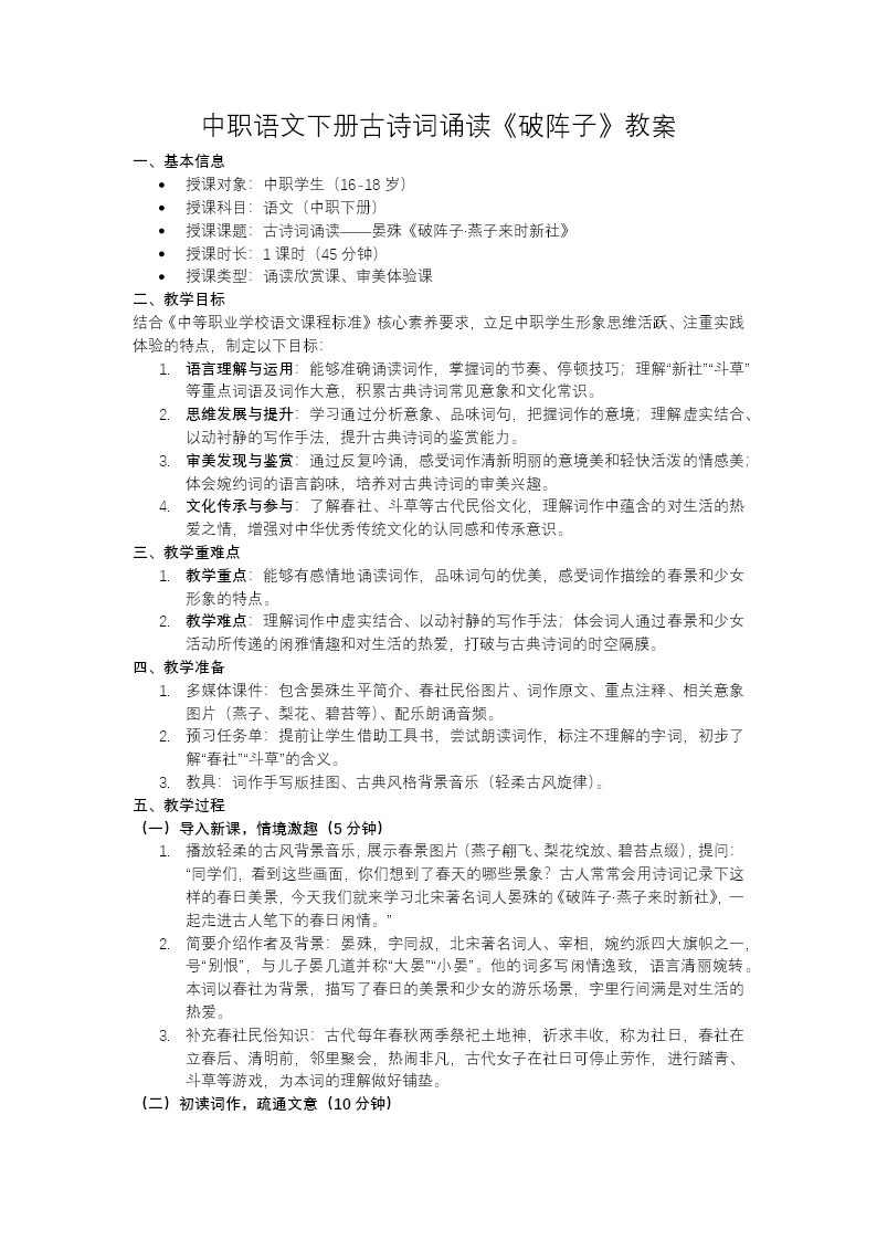 這是晏殊《破陣子·春景》語文教學(xué)課件,共40頁,采用清新雅致古風(fēng)設(shè)計,適配初中或高中宋詞課堂。以任務(wù)驅(qū)動為核心框架:情境導(dǎo)入與素養(yǎng)目標(biāo)以"春社"民俗場景引入,明確語言理解、審美鑒賞等教學(xué)目標(biāo)。分層教學(xué)任務(wù)分五項:任務(wù)一"因聲求氣",完成詞牌解題、文學(xué)常識、注音釋義與詩歌朗誦,掃清基礎(chǔ)障礙;任務(wù)二"以意逆志",逐句解讀詞作,分析上片春日意象與下片少女形象,賞析對偶、白描、虛實結(jié)合等藝術(shù)手法,體會詞作明媚歡快的基調(diào);任務(wù)三"知人論世",介紹晏殊生平、婉約詞派地位與創(chuàng)作背景,幫助學(xué)生理解詞作風(fēng)格;任務(wù)四"對比閱讀",與杜甫《蜀相》對比,分析不同作品中"黃鸝"意象的情感差異;任務(wù)五"隨堂檢測",通過默寫題鞏固所學(xué),最后布置場景描寫作業(yè),深化對少女形象的理解。